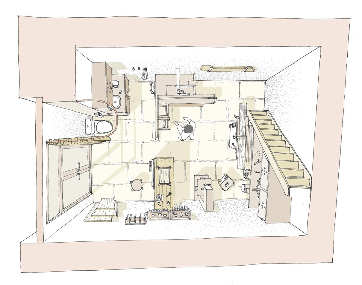 Vue en plan 3D de l'aménagement d'un atelier d'ébénisterie dans une ancienne grange.